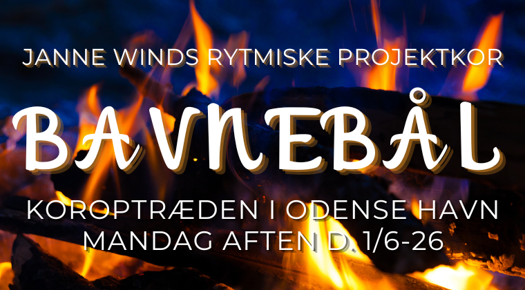 Du kan blive en af 400 sangere i Bavnebål – Janne Winds rytmiske projektkor – når vi sætter den mest spektakulære musikalske stemning Odense længe har set. Der sker nemlig noget stort i Odense Havn mandag aften d. 1. juni - og du kan være del af det musikalske soundtrack! Vi mødes på Tysklandskaj og sætter ild i stemmerne – et kæmpe rytmisk kor under åben himmel, som et traditionelt bavnebål, blot med korsang. Vi varmer havnen op med rytmisk flerstemmig pop – blandt andet med fynske og odenseanske kunstnere og synger i ca. en times tid. Det bliver helt sikkert en af de oplevelser, vi sent kommer til at glemme!